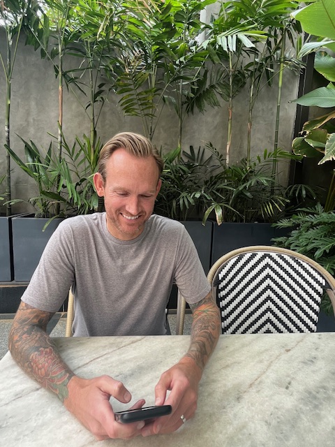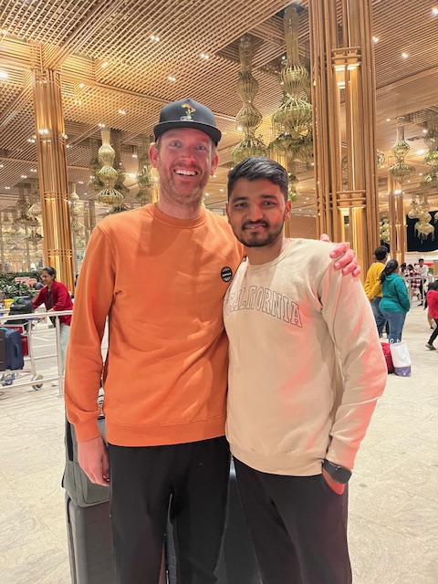 I hope to never forget seeing Bry come out of the airport. There were more white people than I expected, coming out of the airport at that time, but in his hat and orange (Vissla?) sweatshirt, I spotted him immediately. Of course my eye sight is shit and I’ve been known to mistake other people for him at a distance before so I kept my excitement under control until we were near each other. Mallappa caught a video and picture of the scene. It was really cool to see him and Mallappa meet.