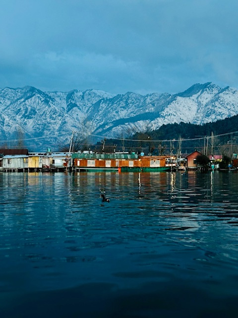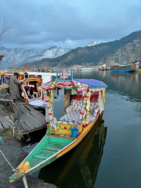 More good food and sleep and the next day, we headed to Srinigar’s Dal Lake for a stay on a houseboat. It was like out of a dream! We reached the edge of the lake where a long thin paddle boat was waiting to take us to the houseboat we had rented for the night; the owner was there to greet us and show us the boat. The lake was calm and surrounded by the snowy Himalayas. We reached the houseboat (almost like a double-wide mobile home boat mixed with a river boat) and inside was so cool. Very antique-y, lots of wood and intricate wallpaper, rugs, and curtains. My room was quaint with a stove right in the middle for warmth.