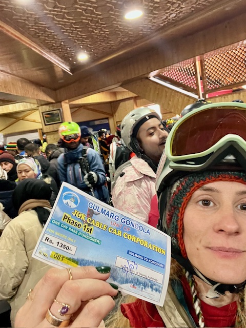 Despite being an absolutely prime, blue bird day, the next day, the gondola was not operating (the only way to get up the mountain). We couldn’t believe it. Hundreds of people stood around the lodge hoping that it would open. We heard rumors that there was a technical issue. Then we heard that if the mountain didn’t open by 12, it wouldn’t open at all. Then we heard that they weren’t going to open the mountain because the tourists wouldn’t have enough time to get up the mountain, take pictures, and come back down before end of the day. It was all very confusing and so different than mountain operations in the US. We texted our ski guide, the tour guide, and the King of the Mountain to see what they could do. Shortly after (I have no idea if our texts made a difference), I noticed people starting to move toward the ticket counter and ran over there. The crowd closed in quickly. Picture a little concession stand with the rolldown cover. Then picture HUNDREDS of people crowed up against it. I was right behind one person who was right against the counter. Prime position. We waited and waited about 45 minutes, totally stuffed together in all of our snow clothes, just waiting. Eventually, the started to sell tickets. As soon as the guy in front of me got his tickets, I wedged myself into his place. The Indian men around me were taken aback, “whoa! You’re a strong woman, I didn’t expect that!” (Eye roll) Obviously they expected that they would just be able to push me out of the way. I said, “I’ve lived in India since August, I know how this works, I’m not losing my spot.” I got three gondola tickets and we started the fight in the gondola line.