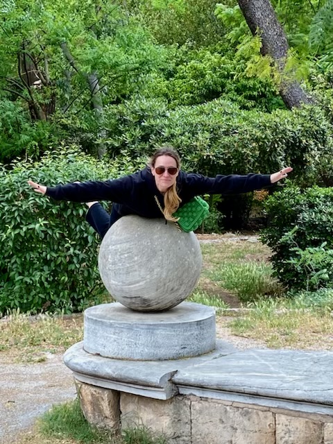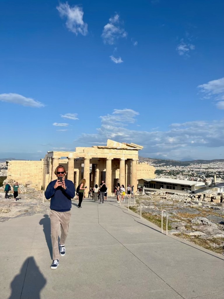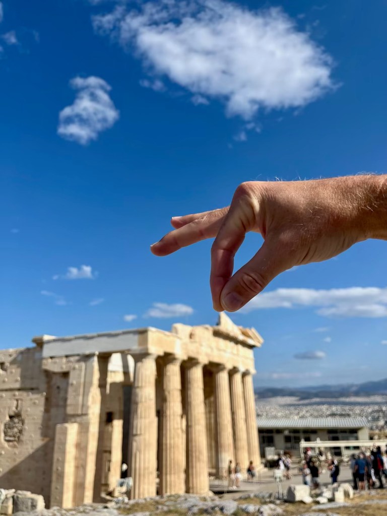 The next day, we got up early and wound our way through the cutest neighborhoods on our way to the Acropolis. We saw a Starbucks but it wasn’t open yet so went next door to another coffee shop and had amazing coffee and pastries. When we got there, it hadn’t opened yet (part of our plan) and only a few other people were waiting. We got in line and when they opened the gate, we high-tailed it up the hill. It was a hike, lots of walking, and at a decent incline but we had read that the way to do it was to get straight to the top before too many others reached. It was remarkable. The history is outstanding and it is so cool to think of these structures being built so long ago and that they are still standing through the various empires since. The Acropolis was another one of the, “I can’t believe we are together IN GREECE.” We walked around, read the history, took pictures (took some silly pictures as by this time, we had gotten in the silly habit of lining Bryan’s hand up with different backgrounds as if he were holding, standing against, propping up whatever was in the background).